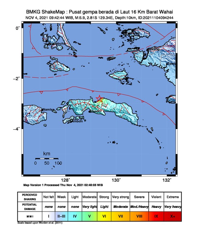 Gempa M 5,9 terjadi di Maluku Tengah pada Kamis (4/11) pukul 09.42 WIB. Gempa ini tidak berpotensi menimbulkan tsunami.