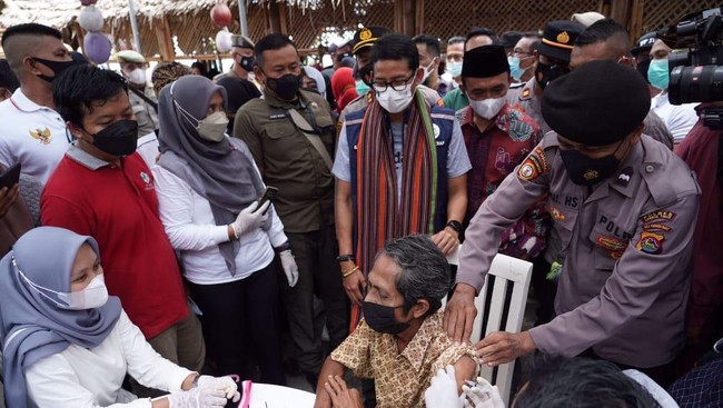 Relawan Kawan Sandi (RKS) di Lombok, NTB, menggelar vaksinasi Corona massal. Acara vaksinasi ini dihadiri oleh Menteri Pariwisata dan Ekonomi Kreatif (Menparekraf) Sandiaga Salahuddin Uno.