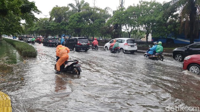 Selain itu, dari foto yang diterima detikcom terlihat genangan terjadi di Jalan Raya Daan Mogot, Jakarta Barat. Bahkan terlihat seorang pengendara roda dua menuntun motornya melewati genangan tersebut.