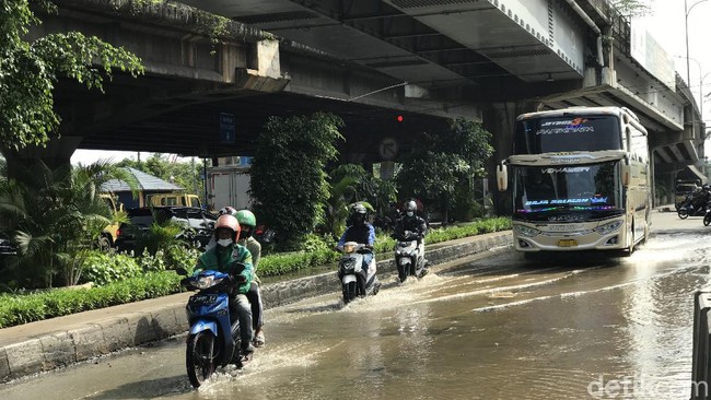 Banjir juga menggenangi Jalan Puri Kembangan Jakarta Barat. Pantauan detikcom di lokasi, Senin (8/11/2021) sekitar pukul 08.10 WIB, air masih menggenangi jalanan. Diperkirakan tinggi air mencapai 10 sampai 15 CM.