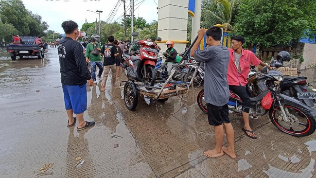 Pantauan detikcom di lokasi, Senin (8/11/2021), banjir rob di kawasan Pelabuhan Perikanan Samudera Nizam Zachman Muara Baru, Penjaringan, Jakarta Utara mencapai 70 cm. Ada beberapa warga yang menawarkan jasa angkut sepeda motor. Ojek gerobak ini mengangkut sepeda motor pengendara yang hendak keluar dari kawasan pelabuhan ataupun orang yang ingin masuk ke kawasan pelabuhan.