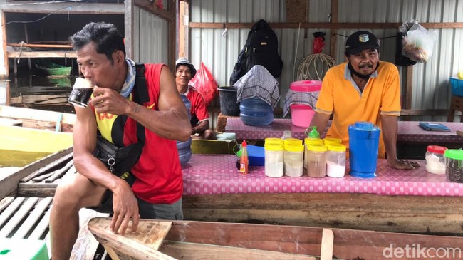 "Kopi, kopi hangat," sapa pak De Ponco kepada pelanggannya yang sebagian besar adalah penarik sampan.