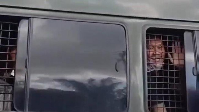 Ada sejumlah tahanan yang berada di dalam mobil. Para tahanan ini terlihat melambaikan tangan ke pengendara yang melintas.