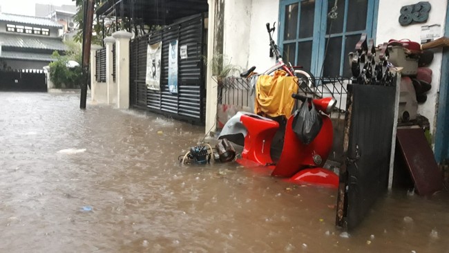 Hingga pukul 17.15 WIB, hujan masih mengguyur kawasan ini. Sejumlah kendaraan yang diparkirkan di pinggir jalan terlihat terendam banjir.
