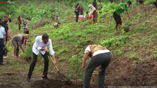 Presiden Joko Widodo (Jokowi) menanam pohon kayu putih dan buah-buahan di Gunung Pepe, Nusa Tenggara Barat (NTB). Jokowi berpesan kepada masyarakat untuk memelihara pohon-pohon yang ditanam agar ke depan tidak terjadi longsor dan banjir.