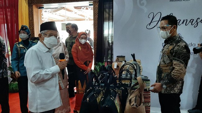 Wakil Presiden Ma'ruf Amin meninjau pameran usaha mikro, kecil, dan menengah (UMKM) di Kantor Gubernur Aceh. Ma'ruf menanyakan keterlibatan kaum milenial dalam menciptakan produk UMKM.