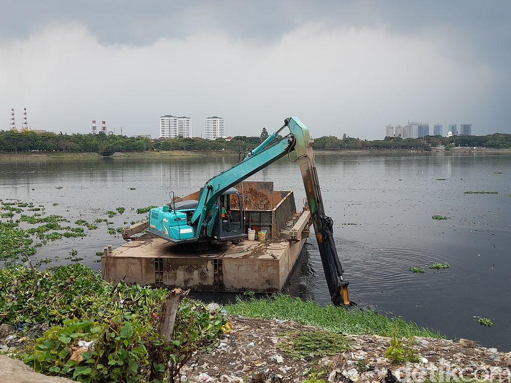 Ekskavator keruk sampah Waduk Pluit, 28 Oktober 2021, siang. (Marteen Ronaldo Pakpahan/detikcom)