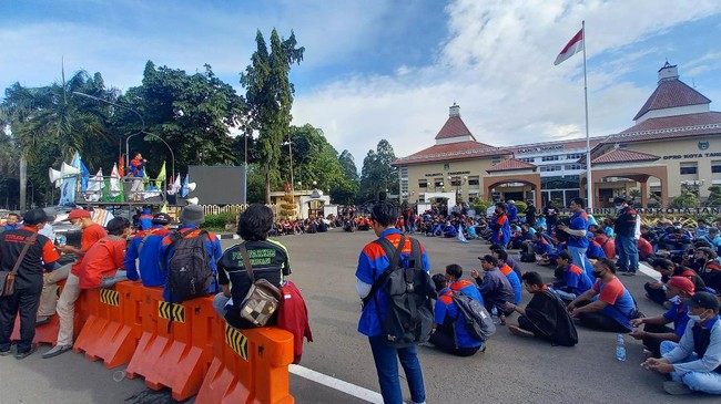 Pantauan detikcom di lokasi, Kamis (18/11/2021) pukul 16.10 WIB, salah seorang orator sedang menyampaikan aspirasi dari atas mobil komando. Massa buruh mengancam akan mogok kerja jika tuntutan mereka tidak dipenuhi.