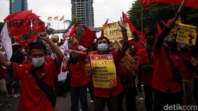 Adapun tuntutan para buruh yang melakukan aksi di depan Kemnaker RI, yakni sebagai berikut: