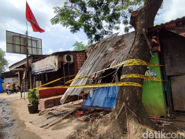 Posko Pemuda Pancasila juga terlihat masih dipasangi garis polisi. Bagian depan posko terlihat rusak.