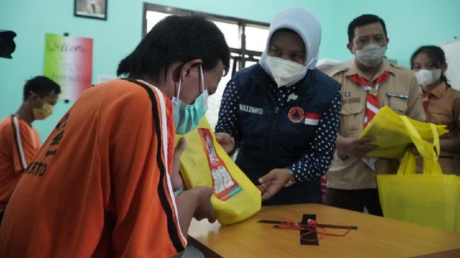 Wali Kota Mojokerto Ika Puspitasari menyerahkan bantuan beasiswa dan seragam ke 35 siswa Sekolah Luar Biasa (SLB) ACD Pertiwi Kelurahan Kranggan. Bantuan ini diserahkan bersama dengan para murid UPZ Kid's SDN Kranggan 1-5 Kota Mojokerto saat kegiatan Jumat Barokah.