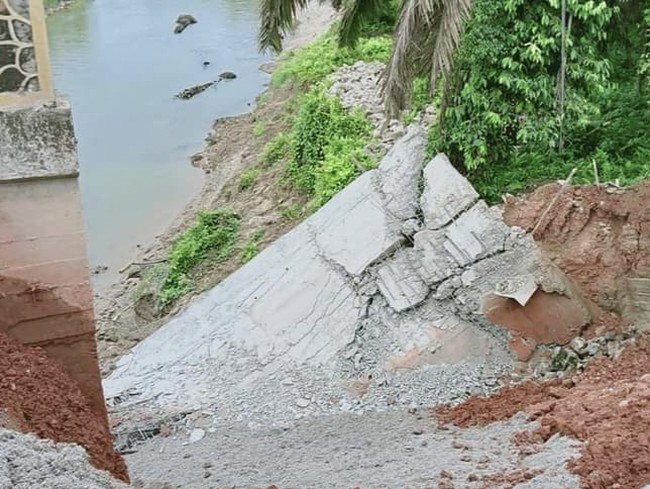 Tampak tembok penahan tebing tersebut runtuh ke sungai. Sebagian ruas jalan juga rusak karena tanah yang ditahan tembok tersebut longsor ke sungai.