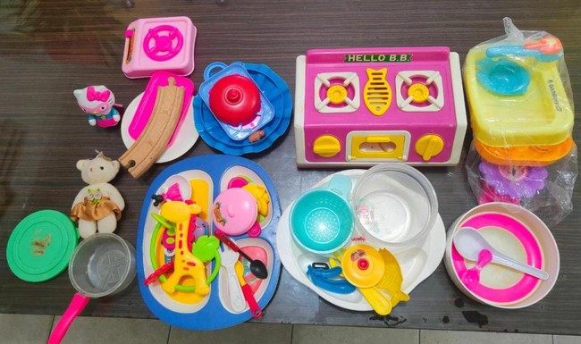 Dia menunjukkan bukti-bukti kasus dugaan pencabulan anak ini, berupa mainan anak. Ada boneka dan mainan perabot masak-masak beraneka warna.