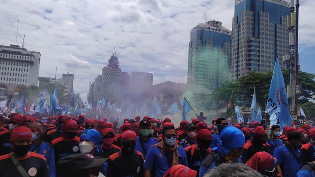 Massa buruh terus berdatangan untuk mengikuti aksi demonstrasi di kawasan Patung Kuda, Jakarta Pusat. Massa turut menyalakan flare. Begini penampakannya.