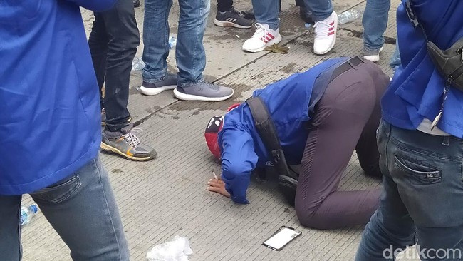 Selain itu, orator mengajak para buruh sujud syukur. Terlihat beberapa orang sujud di jalanan.