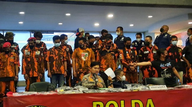 Polda Metro Jaya menggelar jumpa pers terkait demo Pemuda Pancasila yang berujung pengeroyokan terhadap AKBP Dermawan Karosekali. Barang bukti pun digelar polisi.