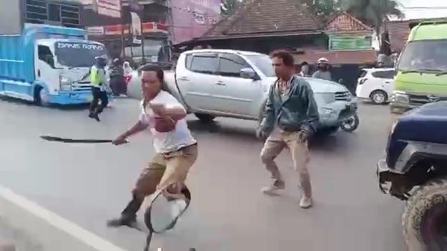 Pria itu lalu datang kembali ke mobil dengan membawa dua sajam. Tangan kanannya memegang parang dan di tangan kirinya ada celurit.