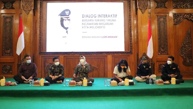 Wali Kota Mojokerto, Ika Puspitasari menghadiri dialog interaktif bersama 96 pemuda Karang Taruna (Katar) Kecamatan Magersari di Ruang Sabha Mandala Madya Pemerintah Kota Mojokerto, Jumat (26/11). Ika menjelaskan forum ini merupakan salah satu upaya untuk menyamakan pemikiran, ide dan gagasan guna mewujudkan Kota Mojokerto yang bermartabat, adil, makmur, sejahtera dan berdaya saing.
