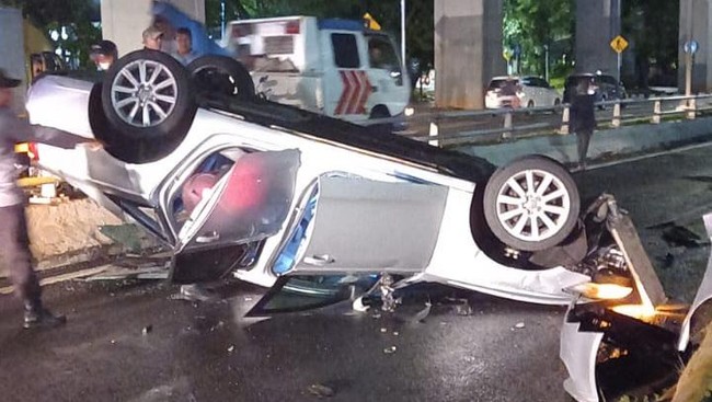 Mobil Audi terbalik di Tol Cawang-Tomang-Cengkareng (CTC) kilometer (KM) 5 dari arah Cawang, Jakarta Selatan. Mobil tersebut menutupi jalur keluar tol Tegal Parang.