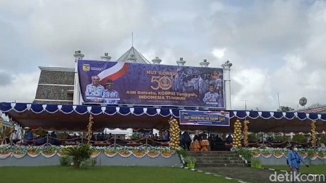 Upacara HUT Korpri ke-50 digelar di halaman kantor pusat pemerintahan Kabupaten Mimika, Senin (29/11/21). Baliho besar yang berisi gambar bendera merah-putih terbalik itu tampak terpasang.
