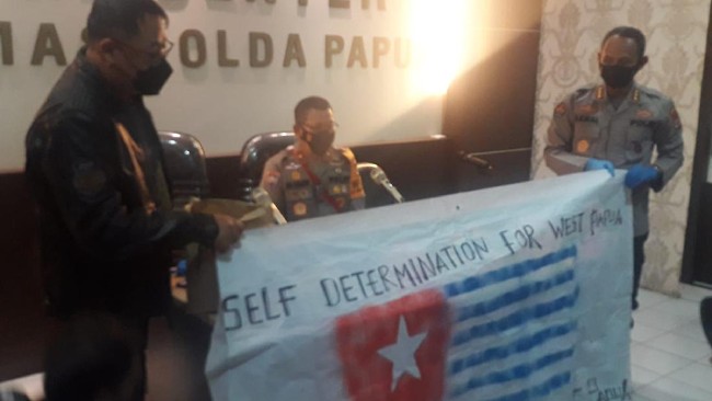 "Barang bukti yang berhasil diamankan 2 buah Bendera Bintang Kejora; 1 buah spanduk bertulisan 'SELF DITERMINATION FOR WEST PAPUA STOP MELITARISME IN WEST PAPUA' dan Satu buah Spanduk bertuliskan 'INDONESIA SEGERA MEMBUKA AKSES BAGI TIM INVESTIGASI KOMISI TINGGI HAM PBB KE WEST PAPUA'," tuturnya.