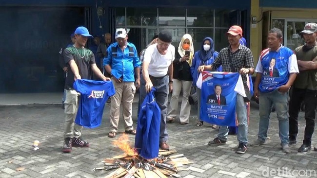 Tidak lama setelah mengutarakan rasa kecewa, kader membuka baju dan atribut Partai Demokrat. Kader kemudian kompak membakar atribut di tumpukan kayu yang sudah membara apinya.