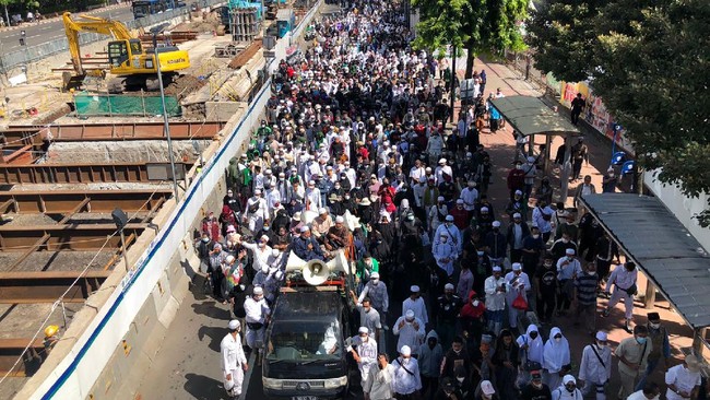 Massa mayoritas berpakaian serbaputih. Massa kemudian berjalan kaki ke arah perempatan Sarinah.