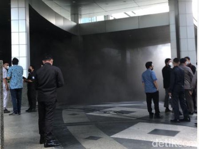 Tampak asap keluar dari lobi gedung. Sejumlah orang yang berlarian keluar dari gedung Cyber 1.
