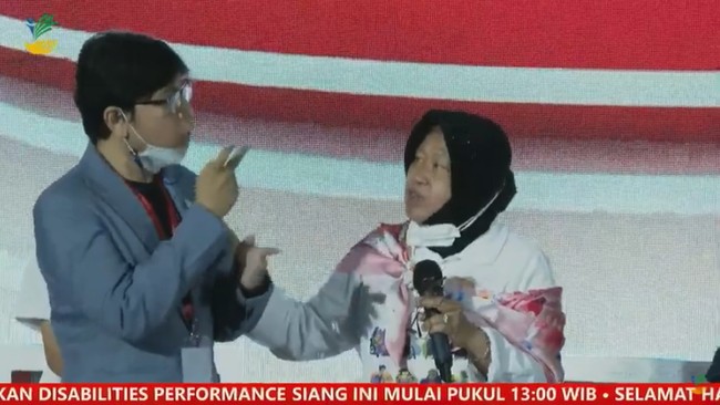 Setelahnya Risma mengajak seorang penyandang disabilitas tunarungu wicara lain bernama Aldi ke atas panggung.