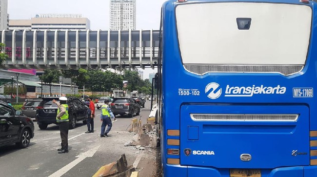 Sementara itu, bagian kiri bus TransJakarta itu menghantam separator busway. Ban depan bus itu hancur menghantam separator.