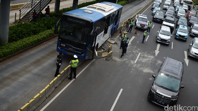 Pada Jumat (3/12), Bus TransJakarta dengan nomor polisi B-7277-TGC menabrak separator busway di daerah Bundaran Senayan, Jakarta Pusat. Bagian kiri bus TransJakarta itu menghantam separator busway. Imbasnya, sejumlah beton separator jalan rusak.