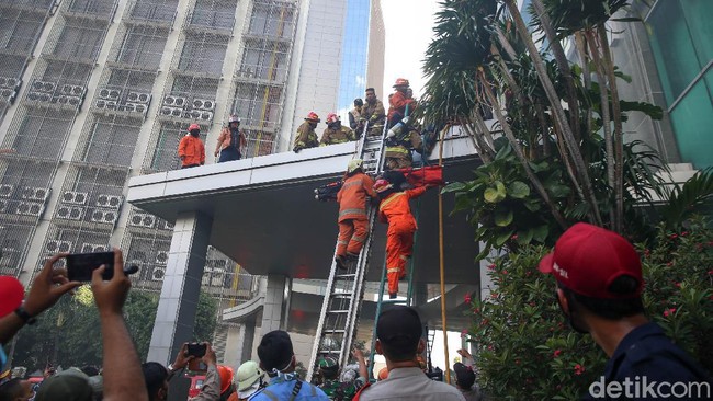 Saksi Septian, yang bekerja sebagai petugas kebersihan, melihat asap tebal keluar dari pintu lobi gedung. Bersamaan dengan itu, para karyawan keluar dari gedung.