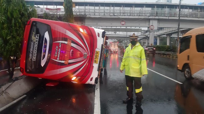 Bus pariwisata mengalami kecelakaan hingga terbalik di Tol Dalam Kota, Jakarta. Polisi menduga kecelakaan tersebut disebabkan sopir mengantuk.