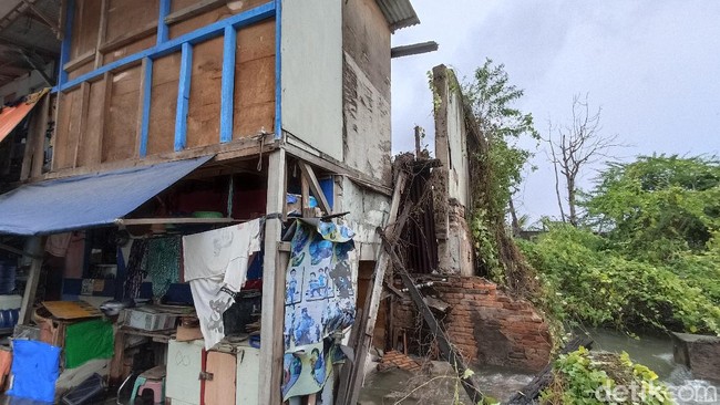 "Itu karena tembok yang udah tua, rumahnya juga kan semi permanen, terus arusnya deras kenceng jadi kedorong," kata Ketua RT 01, Maya (33), kepada detikcom, Selasa (7/12/2021).