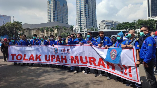 Serikat buruh menggelar aksi di sekitar kawasan Patung Kuda, Jakarta Pusat (Jakpus), terkait putusan Mahkamah Konstitusi (MK) tentang uji formil UU Cipta Kerja dan UMK DKI Jakarta. Massa mulai berdatangan di Patung Kuda, Jalan Medan Merdeka Barat, ditutup menuju arah Istana Kepresidenan.
