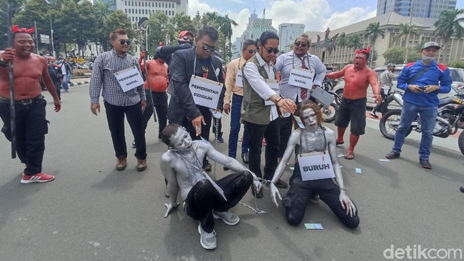 Massa aksi yang tergabung dalam berbagai federasi buruh demo di kawasan Patung Kuda, Jakarta Pusat. Di sela demo, massa buruh melakukan aksi teatrikal.