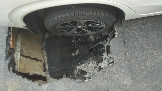 Sebuah sumur resapan di Lebak Bulus, Jakarta Selatan, jebol usai diaspal. Sumur resapan itu jebol saat dilintasi mobil.