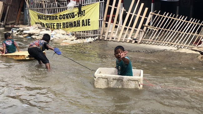 Anak-anak yang tinggal di kawasan itu pun lantas memanfaatkan kondisi banjir rob permukimannya. Banyak dari mereka yang menaiki styrofoam sebagai perahu kecil dan mendayungnya di tengah banjir.