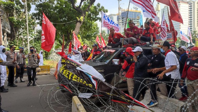 Massa buruh dari KSBSI yang berdemo di Patung Kuda, Jakpus, memanas. Massa mencoba terobos pengamanan kawat berduri.
