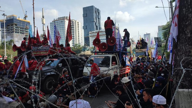 Sebelumnya diketahui, massa mencoba menerobos barikade kawat berduri di Jl Medan Merdeka Barat, Jakarta Pusat. Massa mencoba menerobos pagar kawat berduri dengan mobil komando.