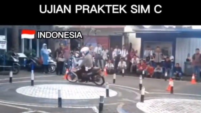 Dalam video berdurasi 40 detik itu, trek uji praktik SIM C di Indonesia tampak berbentuk zig-zag dan melingkar. Bahkan, jalur trek uji praktik itu juga terlihat sempit. Seorang polisi lalu lintas (polantas) terlihat memberi contoh bagaimana melalui trek yang dinilai netizen sulit.