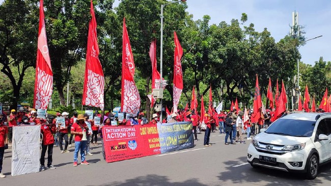 Pantauan detikcom di lokasi, ratusan massa buruh berkumpul di depan kantor Balai Kota DKI Jakarta. Mereka tampak menggunakan baju berwarna merah sambil membawa atribut aksi, seperti banner dan spanduk.