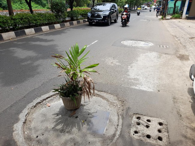 Sebelumnya, beberapa waktu lalu warga menaruh pot tanaman ditutup sumur resapan ini supaya tak ada pemotor yang tersungkur gara-gara permukaan jalan tak rata.