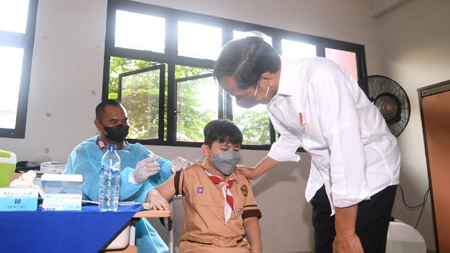 Momen Jokowi menenangkan siswa yang hendak disuntik itu terlihat dari video yang ditayangkan di akun YouTube Sekretariat Presiden, Rabu (15/12/2021). Jokowi terlihat memegang badan dari siswa tersebut. Setelah selesai disuntik, Jokowi pun bertanya ke siswa itu.