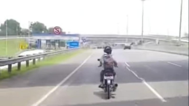 Video pemotor masuk Tol BSD, Tangerang Selatan. Pemotor tersebut mengendarai motor seorang sendiri.