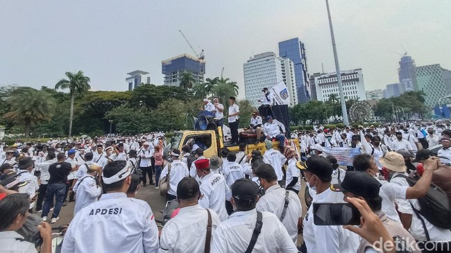 Massa yang tergabung dalam Asosiasi Perangkat Desa Indonesia (Apdesi) menggelar demo di kawasan Patung Kuda, Jakarta. Mereka menuntut revisi Perpres 104 Tahun 2021.