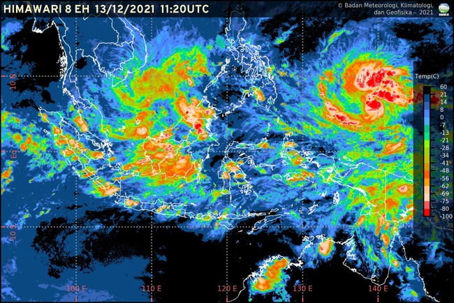Berdasarkan pantauan BMKG sejak Rabu (15/12/2021), masih terdapat Siklon Tropis Rai di Samudera Pasifik sebelah timur Filipina dengan tekanan rendah 970 milibar dan kecepatan angin maksimum mencapai 65 knot.