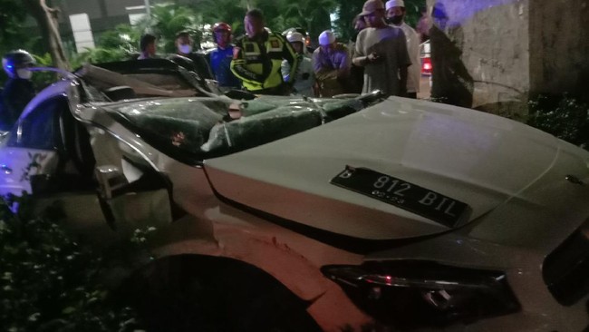 "Mobil lalu menabrak pohon angsana yang berada di taman median jalan tepatnya depan Hotel Mulia dengan posisi terakhir kendaraan terbalik miring dengan posisi roda kanan berada di atas," ujar Eko.