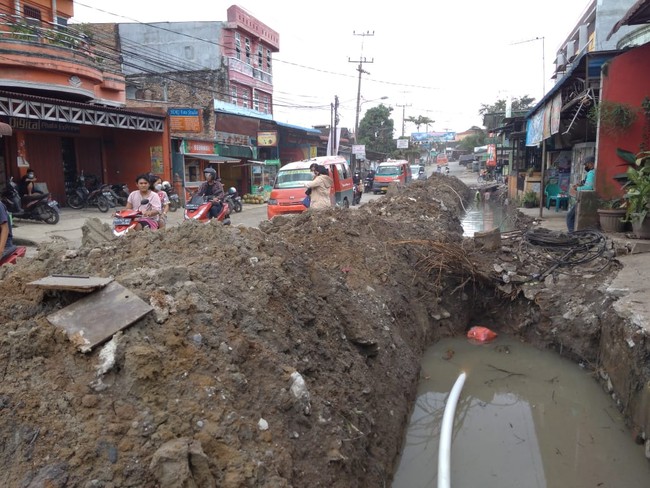 Tumpukan tanah dan lubang galian proyek drainase itu membuat sejumlah warga tak bisa keluar-masuk rumah atau toko. Kemacetan juga terjadi karena jalanan yang semakin sempit.