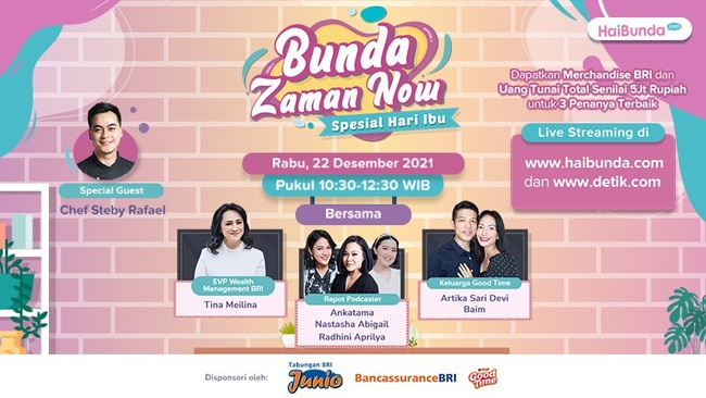 Jangan sampai kelewatan, acara ini akan diselenggarakan pada Rabu, 22 Desember 2021 pukul 10.30-12.30 dan bisa saksikan secara live streaming di haibunda.com serta detik.com di haibunda.com/bunda-zaman-now. Acara 'Festival Bunda Zaman Now' ini juga didukung oleh Tabungan BRI Junio, Bancassurance BRI, dan Good Time.